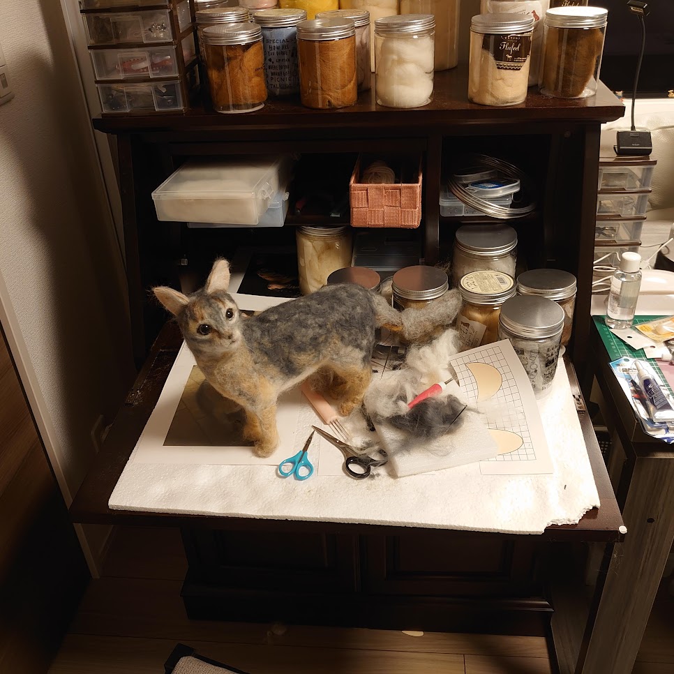 アビシニアンブルーの参考画像を参考に、ななちゃんをよりリアルに似せられるように三度目の修正に入りました。ブルーと言っても実際には青ではなく(詳しい事は分かりませんが、鳥類や魚類と違って、哺乳類の毛色に青色が存在する種はいないのではないかと思っています)、複雑にグレーと薄茶色、白がミックスされているようで、羊毛のどの色をどう使ってこの色味を表現できるかが、作家の腕の見せ所なのです。