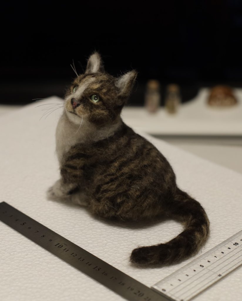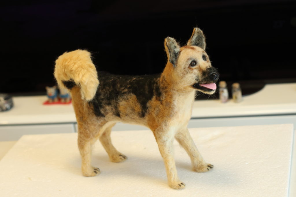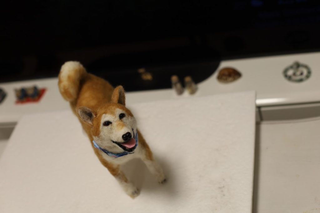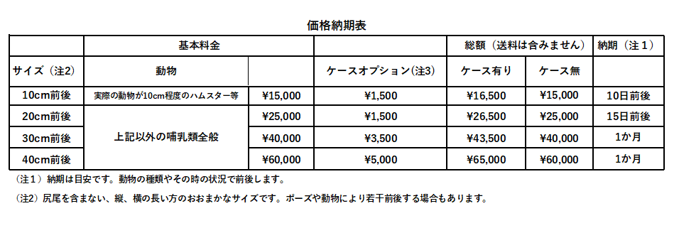 羊毛フェルトオーダーに関して Contents1 うちの子オーダー製作賜ります2 メールでのお問い合わせ及びご依頼3 オーダー製作に関してご提示いただく主な内容4 こちらからお見積りのご提示5 製作途中でのご確認のお願い6 修正後のご確認7 お買い上げまたはキャンセルに関して8 価格及び納期に関して9 ケースオプションに関して10 野生動物のオーダー製作も賜ります11 小さいサイズやお求めやすい価格の製作も賜ります12 注意事項13 オーダー作品事例14 パンダウサギ15 秋田犬子犬16 野生動物 うちの子オーダー製作賜ります 犬、猫、ハムスター等の大切なペットを提供頂いた写真を元に、羊毛フェルトで可能な限りリアルに再現いたします。爬虫類等羊毛フェルトではリアルに表現できない為、製作出来ない動物もあります。メールにてお気軽にご相談ください。 ご依頼をご検討頂ける場合、以下の流れで制作にかかります。 メールでのお問い合わせ及びご依頼 先ずは〇お問い合せ〇フォームより、お気軽にご依頼内容をお問い合わせください。最初のご返事は翌日までにはいたしますよう努めますが、諸事情によりご返信が多少遅れる場合も有ります事ご了承ねがいます。 メールタイトルにはオーダー希望を頭に付けていただきますとたすかります。 オーダー製作に関してご提示いただく主な内容 製作をご依頼される動物の写真は全身の体形、色、顔の特徴が分かるようになるべく多くの写真を送ってください。写真以外には、制作する大きさ、ご希望のポーズがある場合にはポーズのイメージを教えてください。ポーズ指定が無い場合にはこちらからポーズをご提案させていただきます。 こちらからお見積りのご提示 ご提示頂きました写真、ポーズを元に、おおよその納期、価格の見積もりをご提示させていただきます。見積もり内容にご納得いただけましたら正式な製作依頼をメールまたはにてお申込みください。 製作途中でのご確認のお願い ある程度製作がすすみましたら、ご確認頂くために途中経過の写真を送らせていただきます。写真に対して修整して欲しい項目が有りましたら出来るだけ具体的にご提示願います。直接実物を見て頂いて対面でご確認いただく事も可能です。但しこの場合東京都以外での場所での確認作業では別途相当の交通費を頂きます。 修正後のご確認 修正後に再度写真を送付いたしますので、ご確認願います。最初のご確認と同様に対面での実物のご確認も可能です。修正後にも気になる箇所がございましたら可能な範囲で再度修正を行います。修正回数に制限は設けませんが。複数回の修正でもご納得いかない場合にはこちらからキャンセルとさせていただく場合もございます。こちらからキャンセルした商品は、元となる写真がご依頼主の物であっても、製作した商品の著作権はこちら側にあるものとし、別途他の方に既製品として販売する事をご了承していただく事といたします、 お買い上げまたはキャンセルに関して ご確認頂いてご納得いただきましたら売買契約成立として、製品をお手元に発送させていただきます。製品がお手元に届きましたら別途料金を指定口座にお振込みいただきます。 ご納得頂いて売買契約が成立したあとで、実物を見てからご納得いかなかった場合には、キャンセルして頂いて大丈夫です。この場合こちらに製品を返却する送料のみご負担いただきます。なお、中途キャンセルの場合と同様に、返却された製品の著作権はこちらにあるものとし、別の方に既製品として販売する事を了承して頂く事といたします。 価格及び納期に関して 製作費用と納期は、動物の種類によらず、サイズで異なります。製作不可の動物(爬虫類等)もありますので、製作の可否はお問い合わせください。価格と納期は下記をご参照ねがいます。 サイズは横型の場合鼻先からお尻まで(尾は含みません)、縦方の場合、頭頂から接地部までです。形態ポーズにより若干前後する場合もあり得ます。 送料を別途頂きます。 ケースオプションに関して 羊毛フェルト作品は鑑賞専用で製作されているため、透明ケース等に入れて飾る事をお薦めしています。このため、推奨オプションとしてケースオプションをご用意しております。透明ケースは上の価格表の通り、サイズ毎に値段が固定されています。製作する動物の種類やケースと作品の間のスペースのご要望等でいくつかサイズをご提案させていただく場合も基本的に価格表の値段に統一します。透明ケースの外観は以下の様な物です。 野生動物のオーダー製作も賜ります ネコ科大型動物(虎、ライオン、豹等)やイヌ科野生動物(キツネ、タヌキ、オオカミ等)も写真を元に可能な範囲でリアルに製作いたします。お気軽にお問い合わせ下さい。価格や製作の流れはうちの子(ペット)と基本的に同じです。 – – 小さいサイズやお求めやすい価格の製作も賜ります ご予算に合わせて小さいサイズや価格優先で、あまり手間をかけない製作も